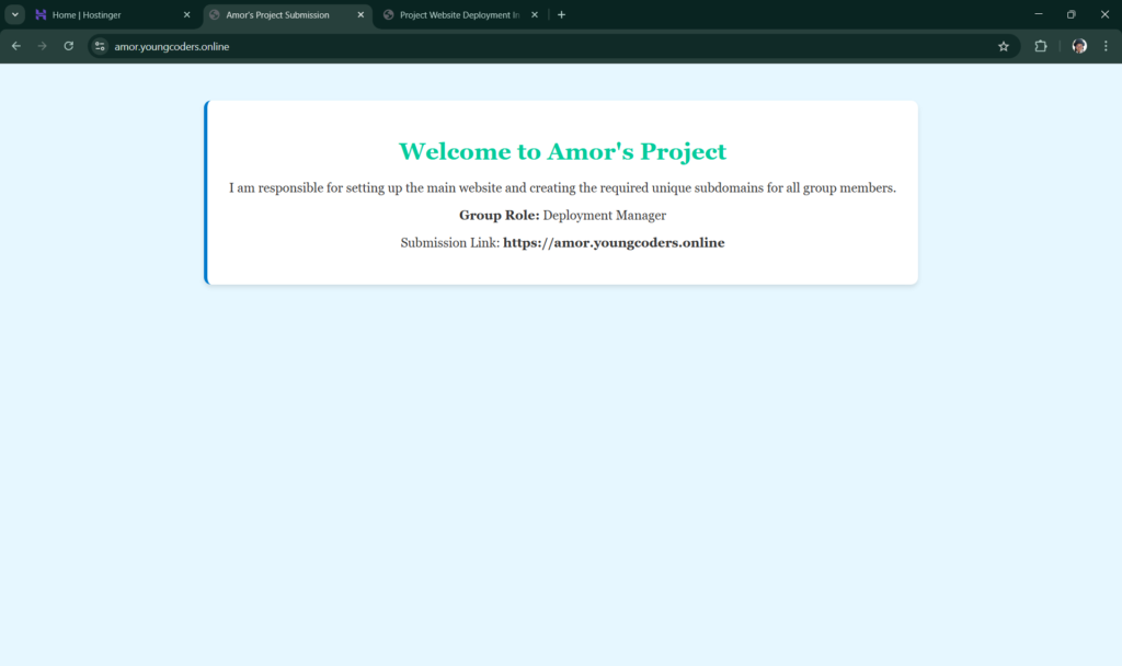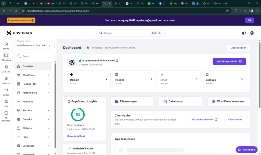 The portfolio project is fully deployed and active, confirmed by the green “Active” status for both the Domain and Hosting shown in the Hostinger dashboard, and is publicly accessible at the live URL aruyaljeaamor.4cfinal.online. The deployment process was streamlined by securing the necessary domain and a Business hosting plan, utilizing Hostinger’s automated script installer to quickly set up the CMS and database, and verifying successful DNS propagation, which instantly made the system available for user testing and subsequent feature integration.